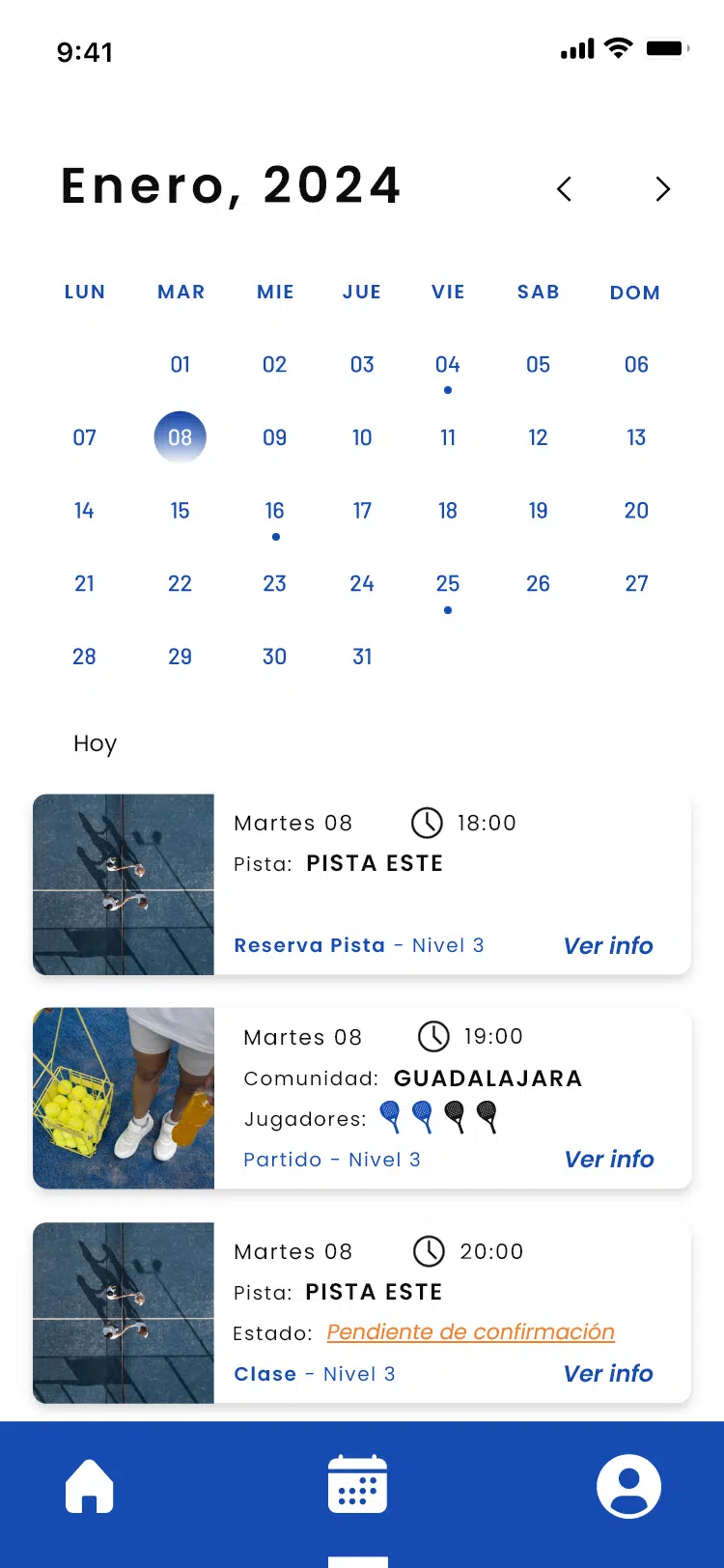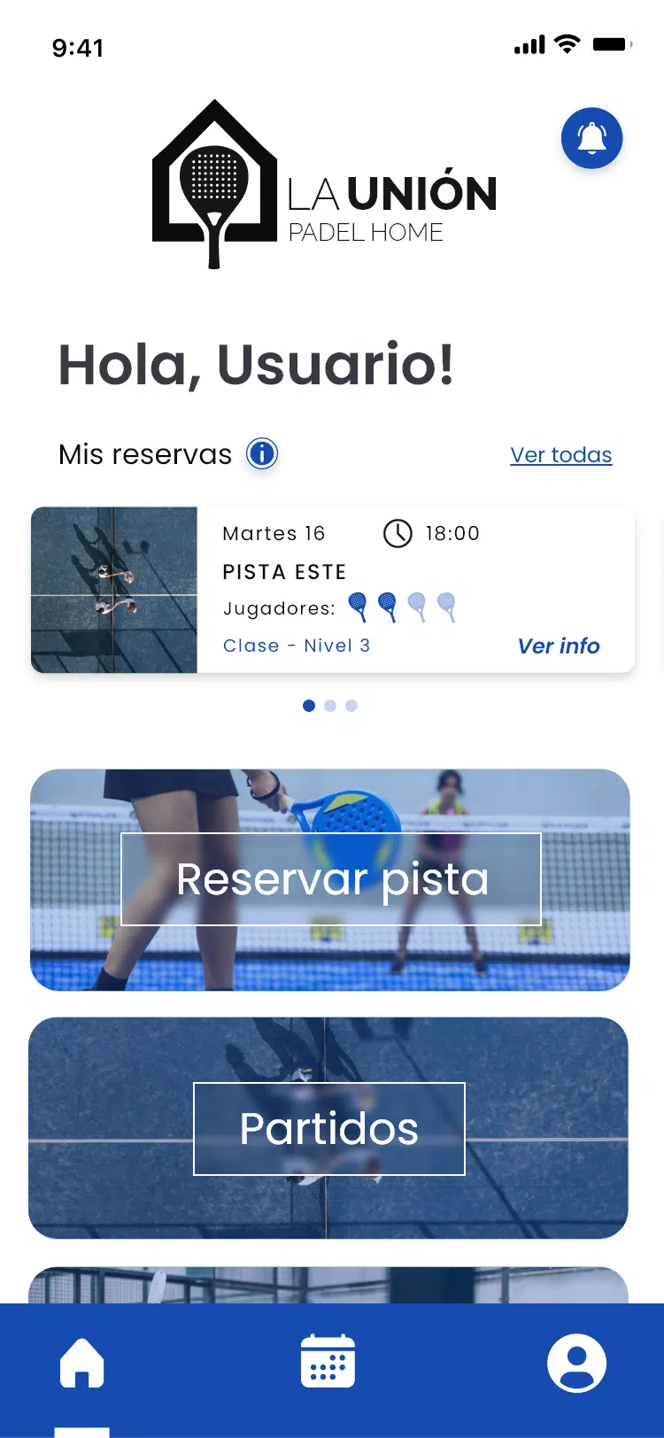 Además, La Unión Pádel Home incluye un calendario interactivo y una zona de reservas personalizada donde los usuarios pueden visualizar y gestionar fácilmente sus horarios, partidos y sesiones. Todo lo necesario para disfrutar del pádel con total organización y sin complicaciones.